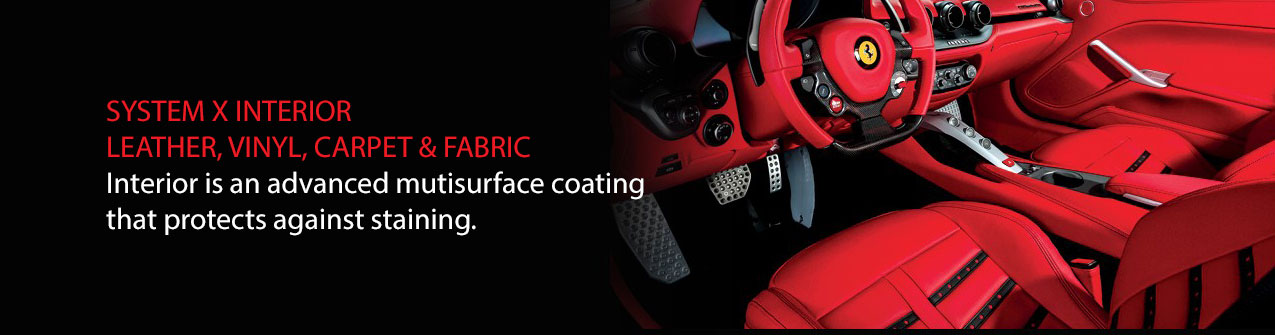 System X Interior™ protects all your interior surfaces; such as fabric seats, carpet, leather, and vinyl with a single professional coating. Spills and stains clean up easily and quickly. System X Interior™ is safe, easy to apply, is low odor, and dries quickly. Sprayed on by hand and air-dried, it provides great protection for your interior without changing the color of your leather, fabrics or carpet.
